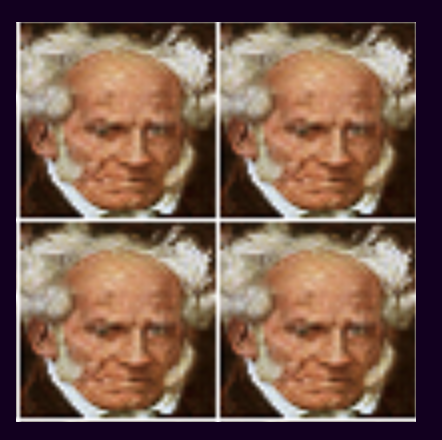 figure 7a 잘 안 보일 수도 있는데 시뻘건 글씨로 'Hello Wordl'라고 쓰인 Hell.png 파일이 잘 입혀서 나온 것을 확인할 수 있습니다. 실제로 지옥과 같은 그림입니다. 이번에는 Sampling에 대한 실험을 좀 진행해보고 싶습니다. 코드를 적당히 고쳐서 단 하나의 Texture만 출력하도록 합니다. 그러면 쇼펜하우어의 얼굴이 다음과 같이 나오게 됩니다.