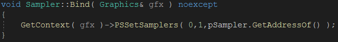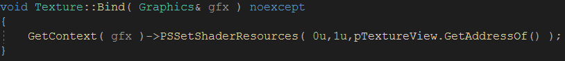 이렇게 구성한 Texture와 Sampler는 결국 Bind를 호출하여 파이프 라인에 정보를 넘겨주도록 합니다. 그런데 아래의 두 Bind 함수를 보면 첫 번째 Argument가 0으로 일치한다는 것을 알 수 있습니다. 이 Start Slot은 Shader나 레지스터 측에서 직접적으로 접근하는 번호와 같기 때문에 둘은 같아야만 합니다.
