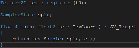 figure 3b 남은 것은 Bind하는 것인데 어렵지 않습니다. 단순히 PixelShader에 셋을 해주면 끝입니다. Texture을 렌더링 하기 위해선 여기서 한 발 더 나아가서 Sampler라는 것이 필요합니다. 이것은 파이프 라인에게 어떤 식으로 Texture을 분석할 것인지 가이드 라인을 제공한다고 보면 됩니다.