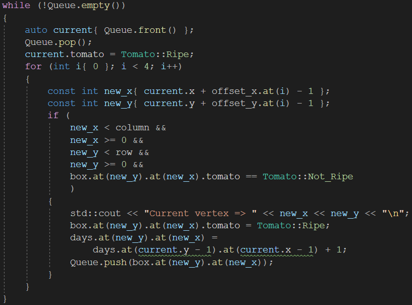제가 원하는 논리는 이전 토마토가 익는 순간의 날짜에 +1을 더해서 현재 검증하는 토마토가 익는 날짜를 구하는 것입니다. 생각해보면 마치 Dynamic Programming과 닮았다고 여겨집니다. 이전에 받았던 값을 그대로 불러와서 쓰는 것입니다.
