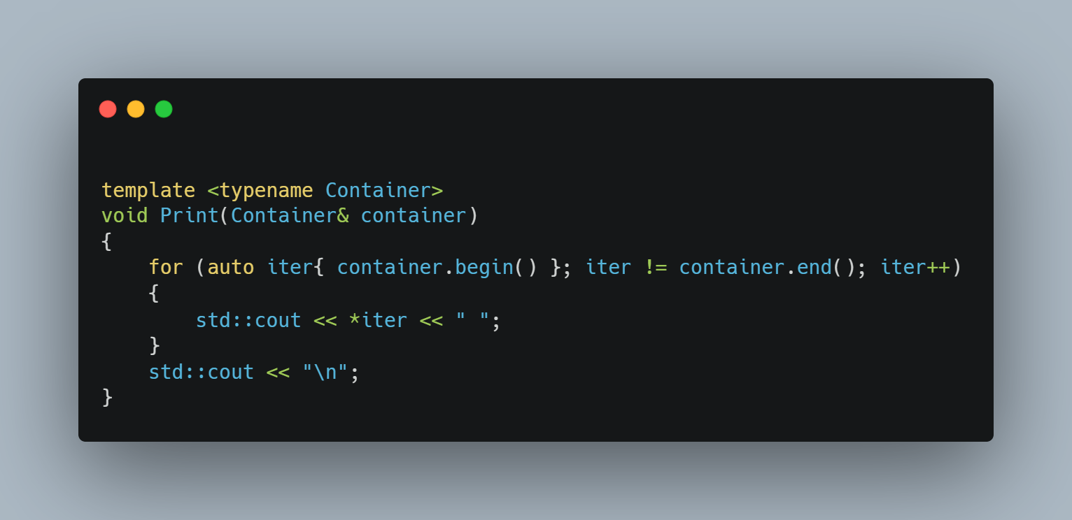 figure 2c 이것저것 인쇄를 해보며 테스트를 해야 하기 때문에 가장 보편적으로 사용할 수 있도록 iterator을 사용해서 구현했습니다. 이제 print 함수는 이것만 있으면 되며 다른 타입의 컨테이너를 만든다면 iterator을 반드시 내장 시켜야 합니다. 몇 번 테스트를 해보면 다음과 같이 적당한 문제를 만들어 낼 수 있습니다.