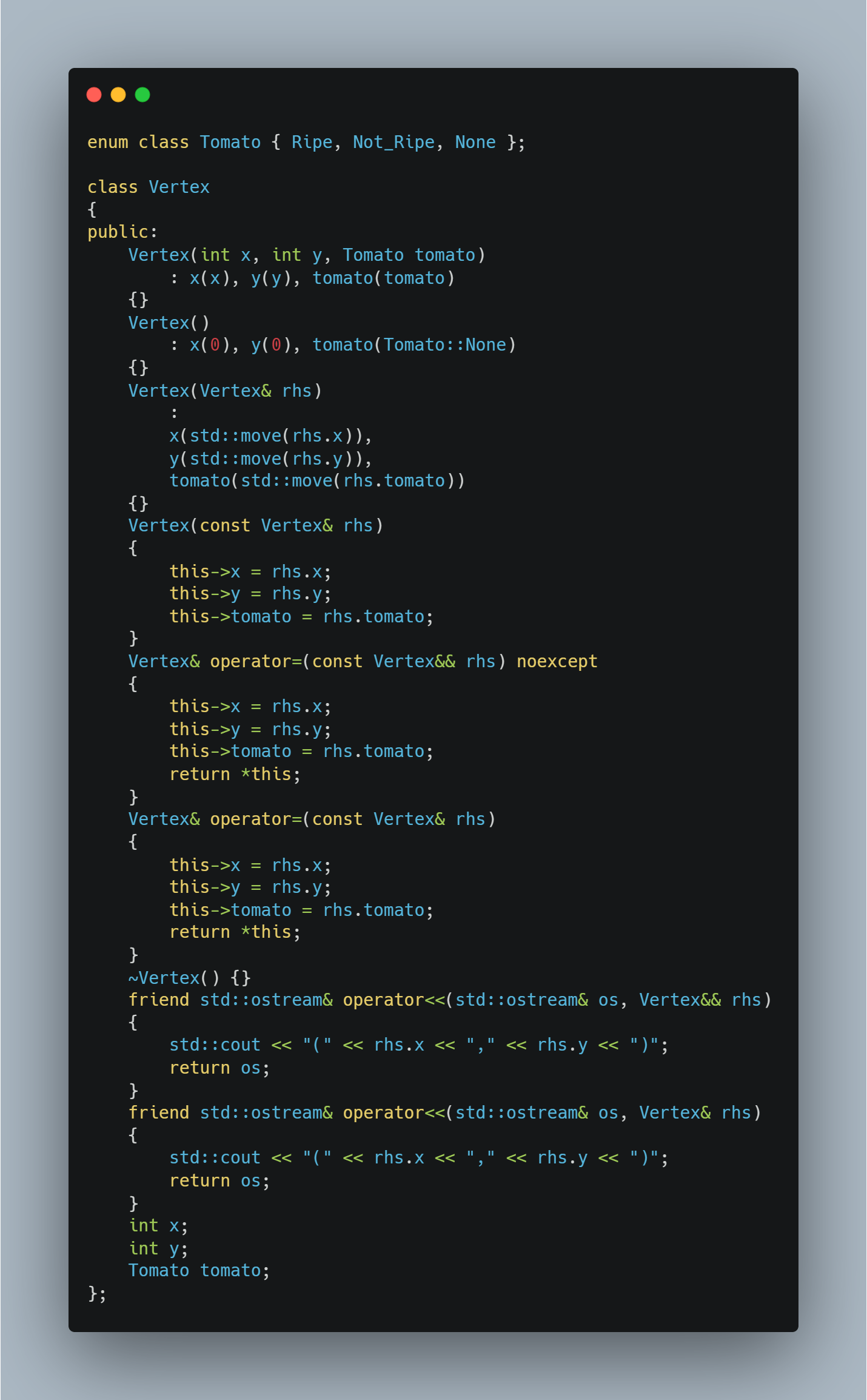 figure 2a Enumeration class을 도입하여 문제를 풀 때 헷갈리지 않도록 했습니다. 익은 토마도는 Ripe, 익지 않았으면 Not_Ripe, 토마토가 없거나 기타 다른 상황엔 None을 부여할 것입니다. Vertex Class의 세세한 부분은 알고리즘 보다는 C++의 다른 문서들을 참조하는 편이 나을 것 같습니다. rvalue/lvalue referenece, function overloading, std::move등의 C++ 지식이 조금 있으면 좋습니다. 가장 중요한, 무조건 있어야 하는 것은 Vertex의 좌표인 x, y그리고 Vertex 자리에 존재하는 토마토의 상태를 나타내는 tomato입니다. 그리고 7576번 문제를 흉내 내기 위해서 다음과 같은 무작위 토마토 상자 생성 함수를 만들었습니다.