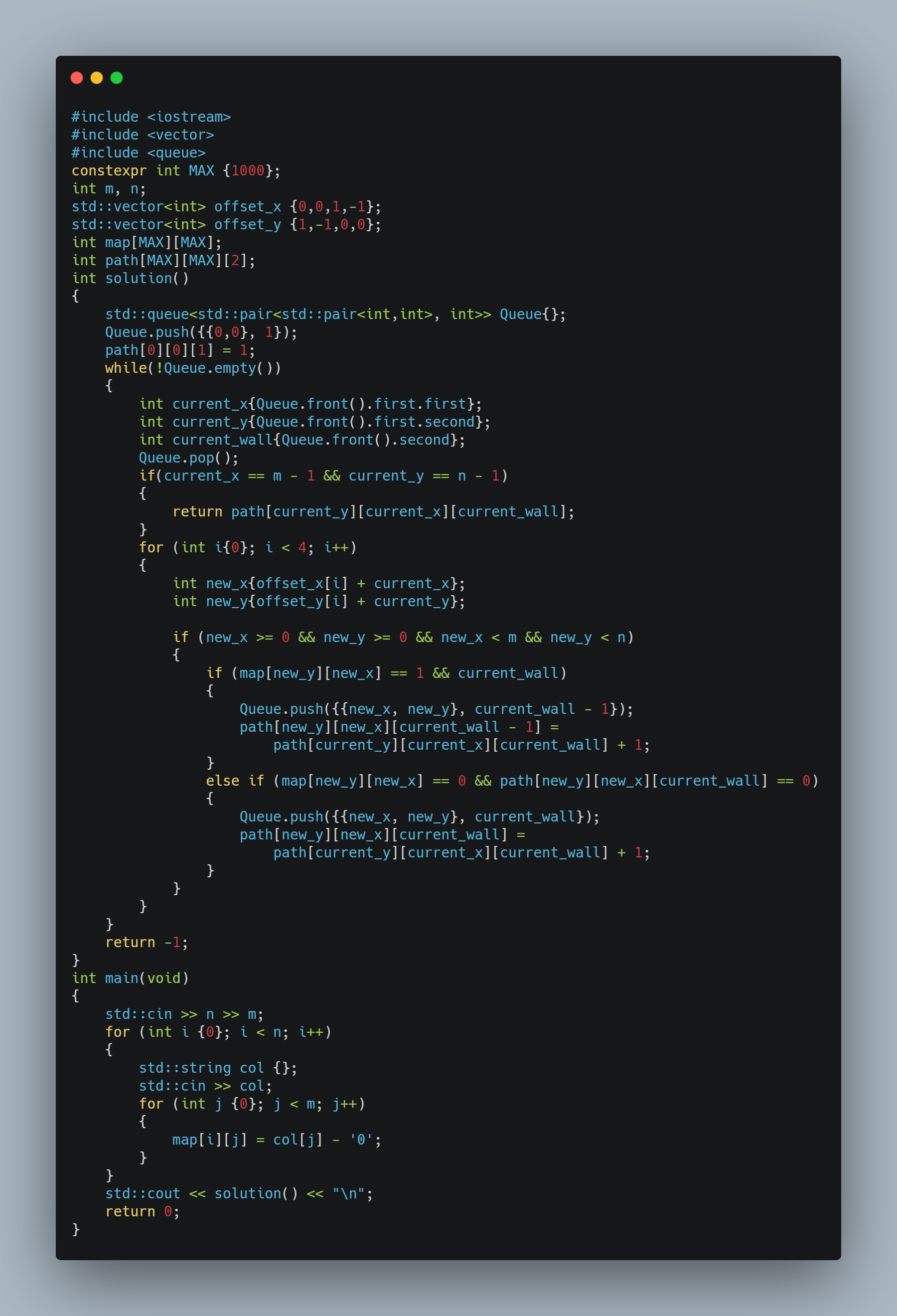 평범한 BFS인데 꼴랑 벽 하나 뚫느냐 마냐로 한 달을 풀었습니다.