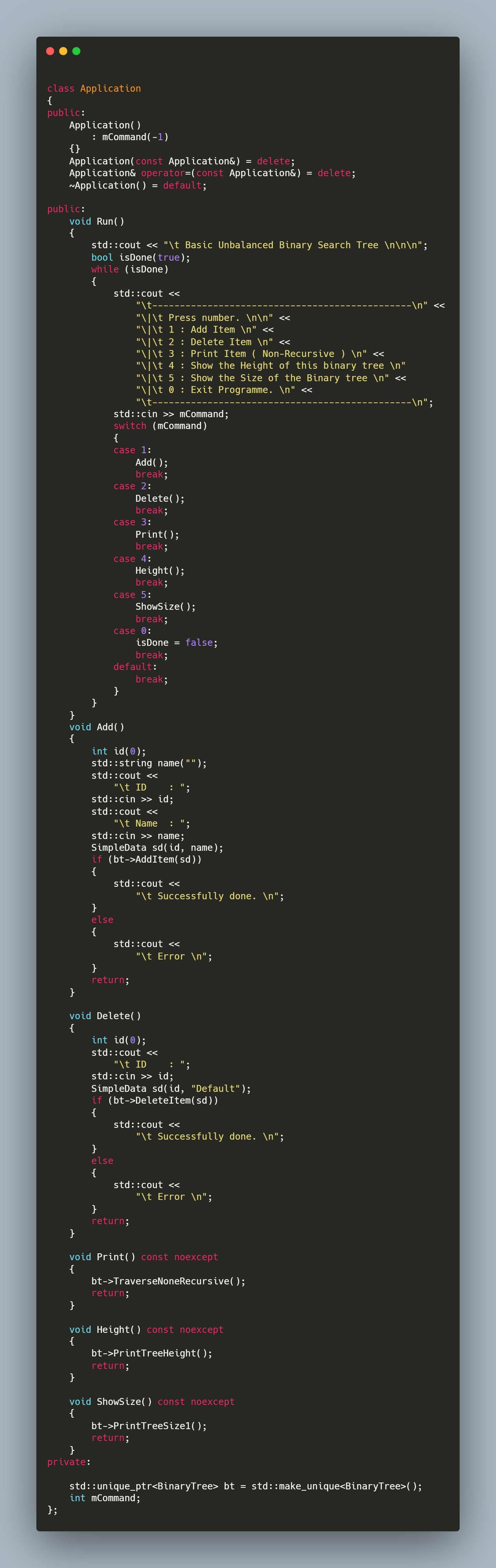 Figure 2.3 Figure 2.3 내부에 구현된 내용은 Figure 3.1부터 시작되는 본격적인 Binary Tree를 이해한다면 자연스럽게 이해가 갑니다. 사실, 그런 내용이 없어도 Application class는 직감적으로 각 Function이 어떤 역할을 하는 지 알기 쉽습니다. 글이 길면 나도 읽기가 싫기 때문에 잠깐 끊어서 작성하기로 했습니다.