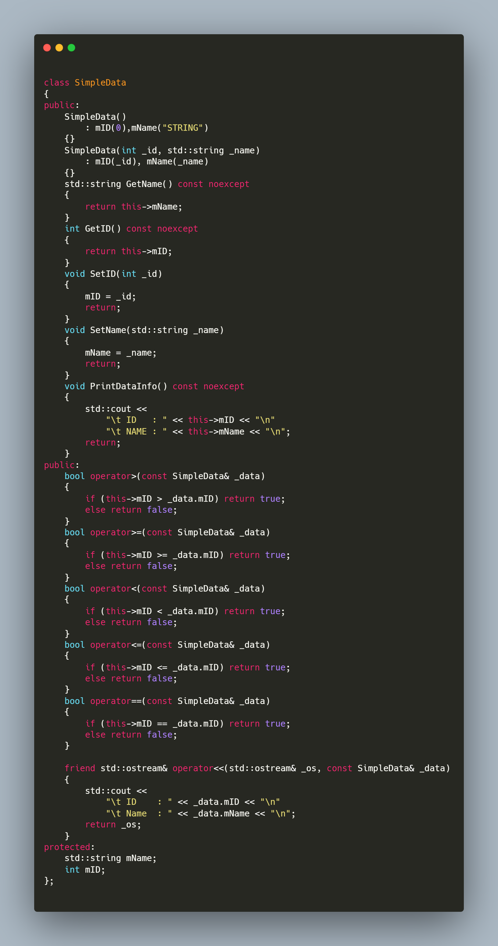 이 데이터에는 ID(나중에 데이터의 대소를 비교하는데 주로 사용될 값)와 이름(별 기능은 없습니다.)이 포함되어 있습니다. 또한, 대소비교를 단순히 operator로 실시하기 위해서 필요한 operator overloading을 간단하게 해두었습니다.