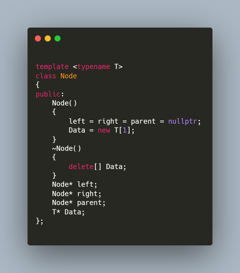 Figure 2.1 다음은 An unbalanced binary search tree에 주렁주렁 달아 놓을 Node를 구현한 코드입니다(Figure 2.2). Template는 하지 않아도 좋습니다. 본인은 하다보니 습관적으로 찍어버렸습니다.