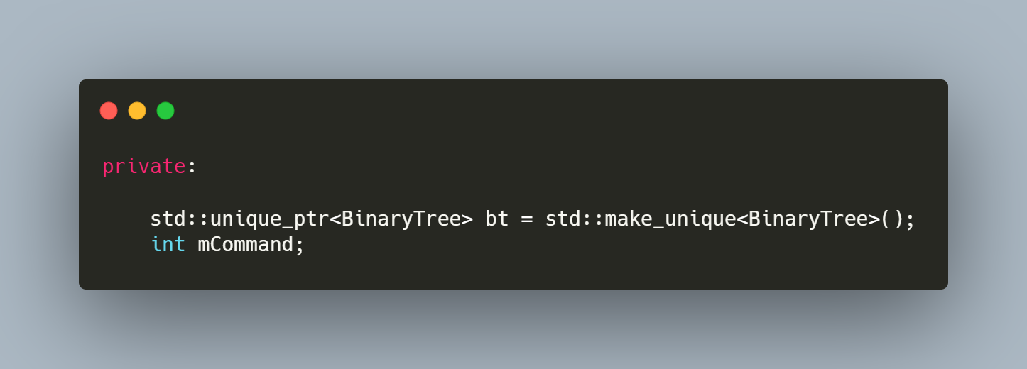 전에 첨부한 Figure 2.3의 Application Class의 Private엔 두 가지의 Member variable이 있었는데 하나는 Application을 다루기 위한 Integer type의 mCommand였으며 다른 하나는 An Unbalanced Binary Search Tree의 모든 Implementatios와 Root Node를 포함한 정보를 가진 데이터였습니다(Figure 3.1).