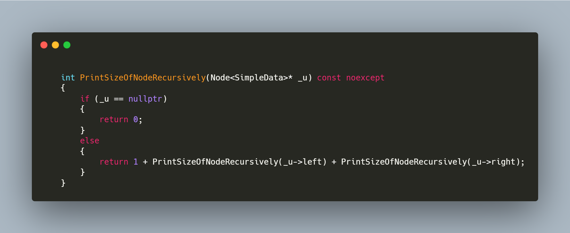 본인은 7개의 Node를 가진 Tree를 그려보고 천천히 코드를 따라갔습니다. 결론적으로 현재 점검하고 있는 Node가 nullptr를 가리키고 있다면, 바로 직전에 호출된 Function의 Return의 1 +F( _u->left ) + F( _u->right )에서 F(left)든 F(right)든 0을 Return하게 됩니다. 따라서 임의의 Node k가 Leaf node라면 좌우 각각 0을 Return해오기 때문에 임의의 node k는 1 + 0 + 0을 Return하게 되고 이는 곧 자신의 Ancestor에게 Descendant가 자신 혼자 뿐이라는 슬픈 정보를 전달해주는 겁니다.