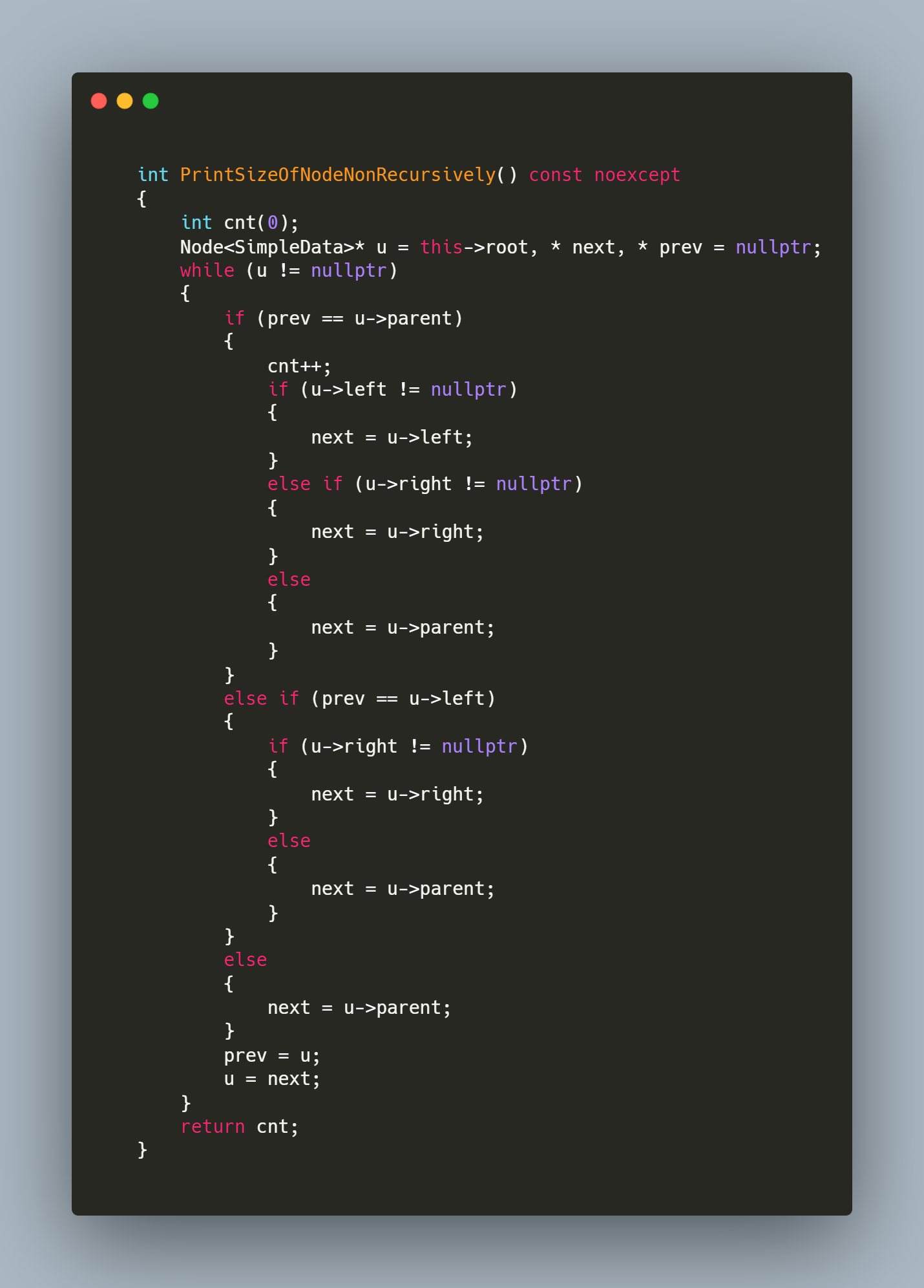 3. 어떤 노드 u에 u->right로부터 도착했다면, 이것은 u에 달린 모든 node(즉, Subtree)를 순회한 것이므로 u->parent로 이동한다.