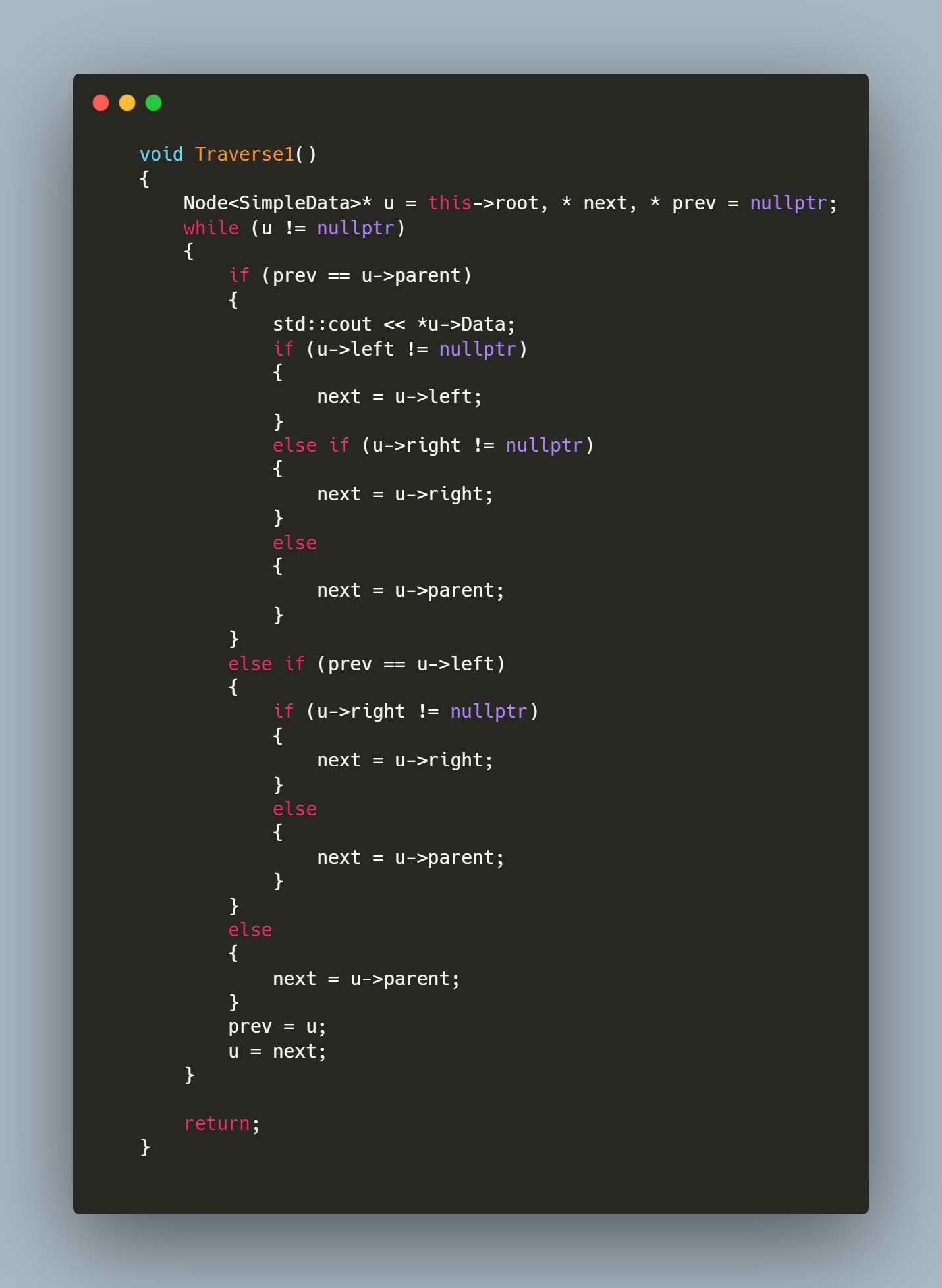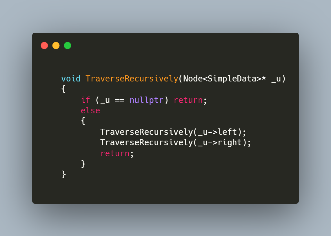 Figure 3.5 참 직관적이고 알기 쉬운 코드입니다. 현재 다루는 Tree는 각 Node의 Data가 작은 값을 좌측으로 몰아주기 때문에 Left부터 순회하도록 했습니다. 코드대로 따라가면 현재 점검 중인 Node _u가 Nullptr일 경우 순회를 중단하고 Return하도록 합니다. 이를 활용하면 각 Node의 Data를 출력하도록 사용할 수도 있을 것입니다.