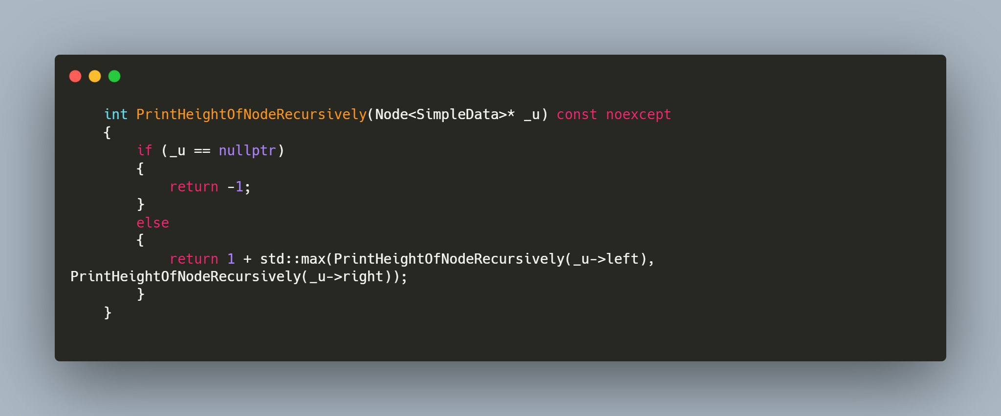 Figure 3.4 else 부분의 Return이 줄이 넘어가버려서 가독성이 떨어져버렸지만 결론은 재귀적으로 호출한 각 두 함수의 최대값에 1을 더해 Return한다는 것입니다. 한 가지 흥미로운 점은 Figure 3.3의 코드와 상당히 유사하다는 점이었습니다. 높이는 Edge를 세는 것이기 때문에 Root는 0이 나오는 것이 맞습니다.