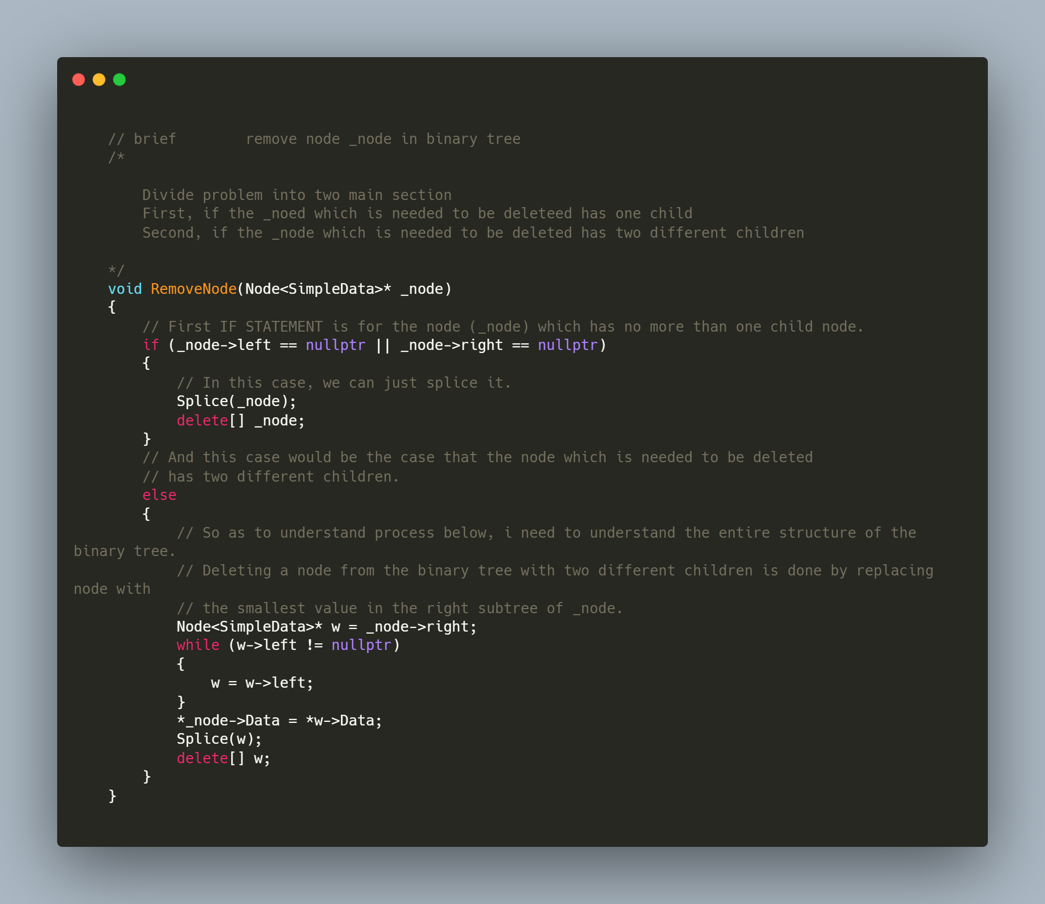정보를 추가하는 것과 달리, 정보를 삭제하는 과정은 까다롭습니다. 만약 삭제하려는 정보를 담은 Node가 Leaf라면 할 일은 Leaf node를 떼어버리는 것 뿐입니다. 또한, 하나의 Child node를 가지는 Node를 삭제하는 것 역시 어렵지 않은데, 이는 Splice라는 Process를 거쳐서 해결할 수 있습니다. Splice의 내용은 Figure 6.1과 같습니다. 엉망진창 부끄러운 영어 주석은 이 Function이 하는 역할을 스스로 이해하기 위해 한땀한땀 박아넣은 것입니다.