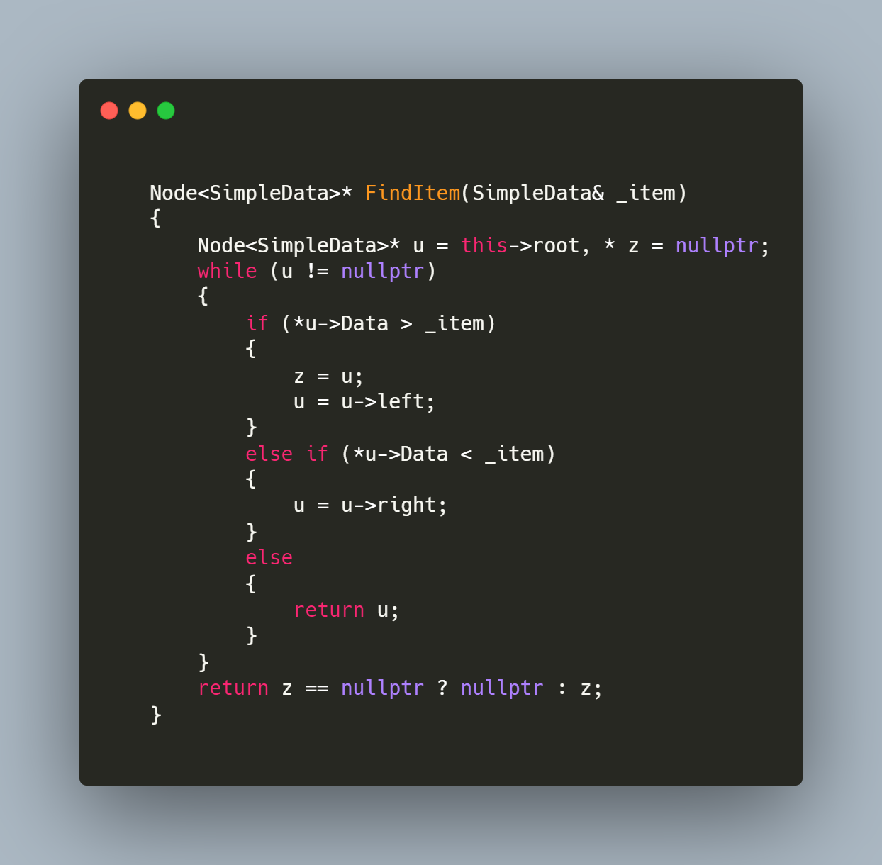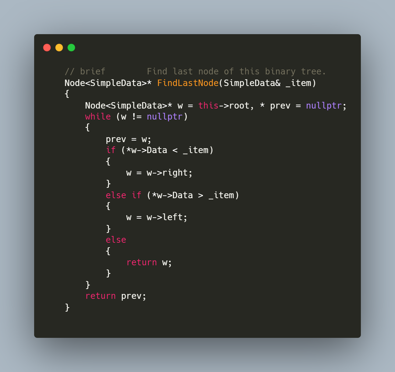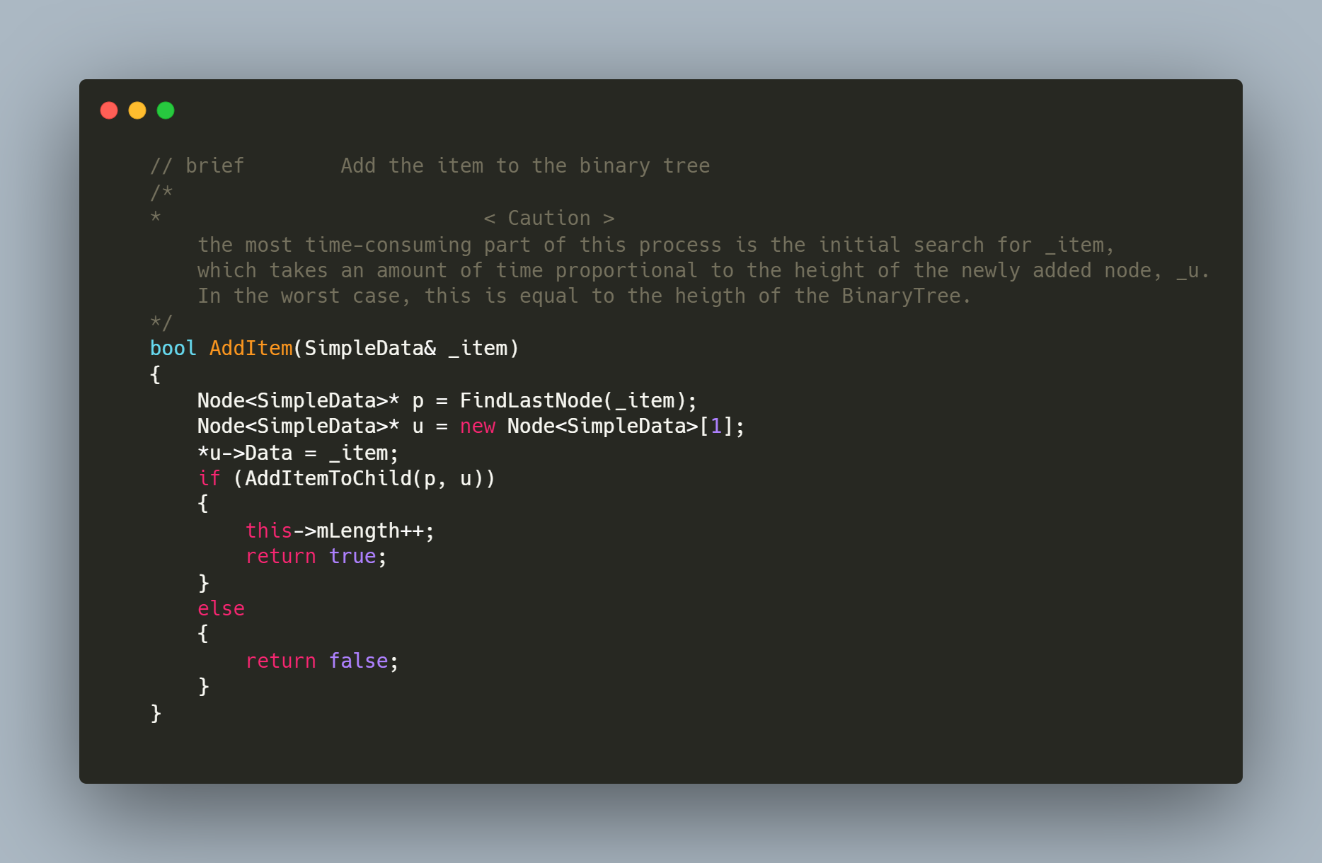 Figure 5.1 Figure 5.2 Figure 5.3 따로 기록할만한 내용은 없습니다. 작성된 코드를 천천히 따라가며 이해하면 좋습니다. Figure 5.2에 나타난 Return엔 두 가지 Case의 Return이 있는데 하나는 Binary Tree 내부에 추가하려는 정보 x가 존재할 경우 해당 Node를 반환하는 Case이고 다른 하나는 Leaf까지 내려갔음에도 불구하고 동일 정보를 찾을 수 없어서 nullptr바로 이전, 즉, Leaf node의 Pointer를 반환하는 Case입니다.