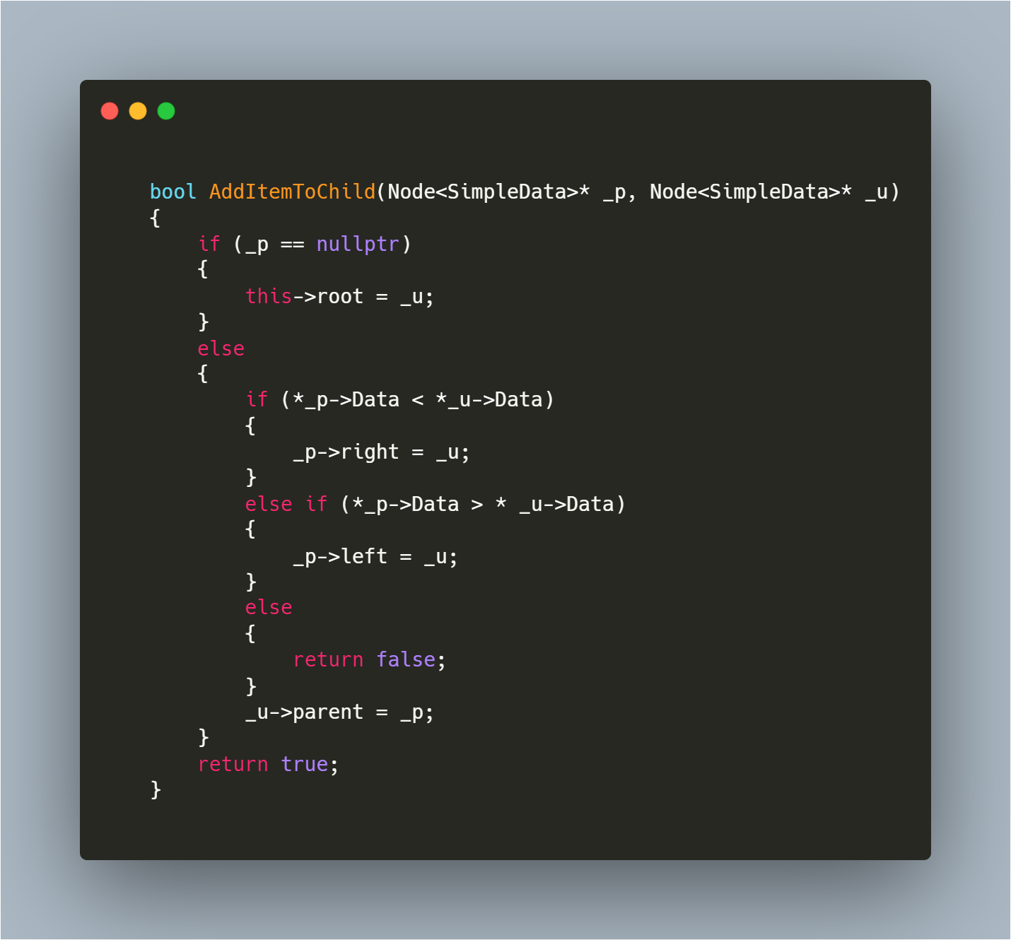 이제는 Binary Tree에 새로운 데이터 x 를 추가하는 과정입니다. 먼저, Tree를 쭉 탐색하며 내려가는 도중에 추가하려는 정보 x와 같은 정보가 존재한다면 Binary Tree에 구태여 무언갈 추가할 필요가 없습니다. 그러나 마지막 Leaf node에 도달했음에도 불구하고 추가하려는 정보 x를 발견하지 못했다면, Leaf node u가 가진 정보와 x를 비교하여 Left child에 추가할 지 Right Child에 추가할 지 결정을 내립니다. 원활한 구현을 위해 이 과정을 세 개의 함수로 나누어 표현합니다.