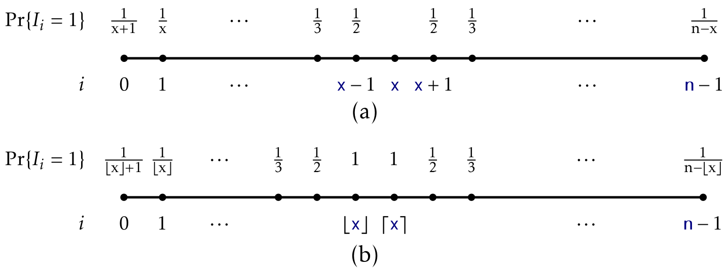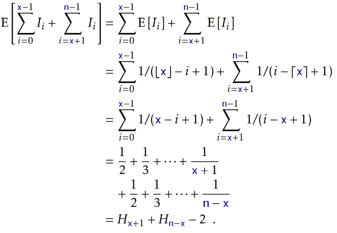 그렇다면 i가 임의의 x를 탐색하는 과정에서 나타날 확률은 다음과 같이 표현할 수 있습니다. 위에서 처럼 permutation Set S` 상에서 i가 x보다 먼저 등장할 경우와 그렇지 않을 경우 두 가지로 나누어 식으로 표현하면 됩니다.