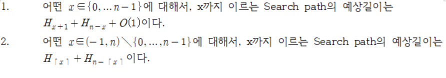이때 사용된 H는 Harmonic number이며 n은 Tree의 Elements 개수입니다. 1.에서 Harmonic number의 아래첨자 x+1과 n-x는 각각 x와 같거나 작은 elements의 개수, x보다 큰 elements의 개수를 나타내는데 이것은 곧 설명이 가능한 내용입니다. 증명하기에 앞서 두 Lemma1이 이르는 바는 원소의 개수가 n개인 Tree가 존재할 때, 어떤 임의의 element를 찾을 때 필요한 Running time은 2ln(n) + O(1)이라는 점입니다. Lemma2는 Tree에 존재하지 않는 원소를 찾으러 나설때 역시 같은 Runnint time을 요구한다는 점을 알려준다.