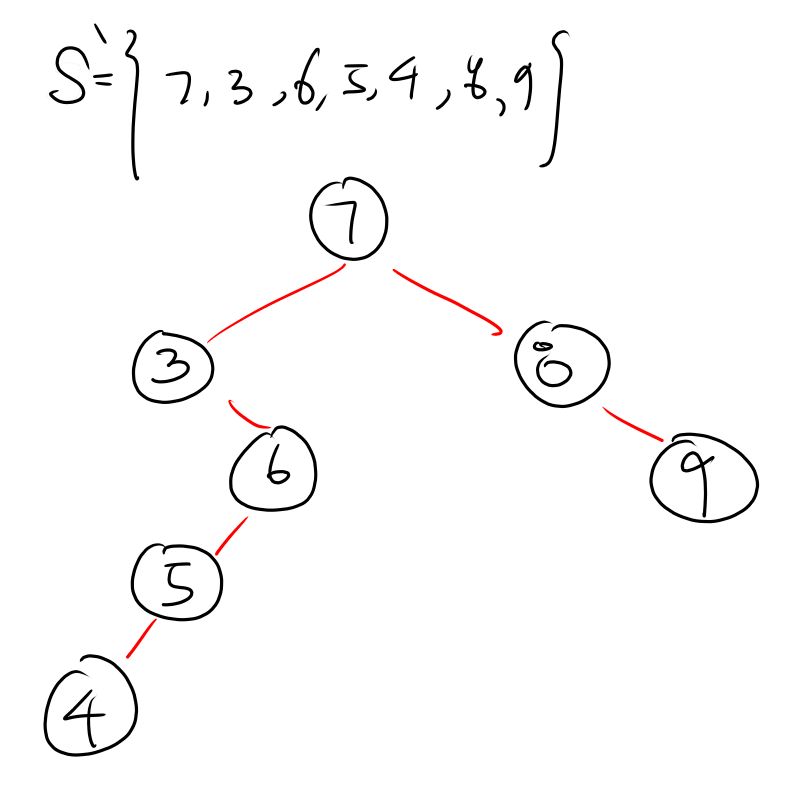 I_{i}를 x를 찾는 경로 상에 i가 등장하면 1, 아니면 0을 반한하는 Random Variable이라고 합시다. 위의 Summation은 Search path의 length입니다. 그림을 그려서 생각해보면 명확합니다. 예를 들어 봅니다. 어떤 Permutation 으로 만든 집합 S`이 { 7, 3, 6, 5, 4, 8, 9 } 존재한다고 하고 Insertion Operation을 연속적으로 수행하여 만든 Tree는 다음과 같습니다.