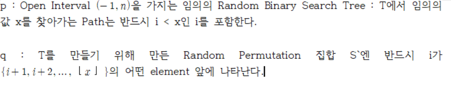 그리고 각 명제 p와q는 필요충분조건이다. 언뜻 보기엔 자명했으나 이해하는데 너무 오랜 시간이 걸렸습니다. 이 두 명제가 시사하는 바는 다음과 같다; 어떤 Random Binary Search Tree인 T를 구성하기 위해 이용한 Random Permutation의 집합 S에서 임의의 i가 x의 Floor보다 먼저 나오면 반드시 Tree T내에서 i가 x를 찾는 경로 상에 등장한다는 뜻입니다.