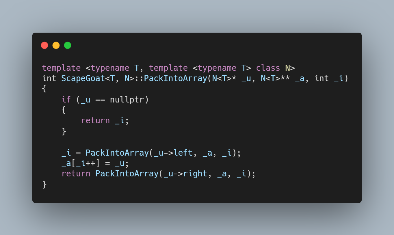 GetSizeOfNode는 Parameter로 전달받은 Node가 가진 Node의 개수를 반환하는 Function입니다. 이 Rebuild Function을 호출할 때 필요한 Running time은 O(GetSizeOfNode(u))와 같습니다. 이 Rebuild Function이 호출된 이후의 n개의 node를 가지는 트리 중 이 Tree보다 낮은 높이를 가질 수는 없습니다. 다음은 PackIntoArray함수입니다. 재귀를 통해 구현했기 때문에 이해하기가 번거롭고 짜증납니다. 재귀함수, Dynamic Programming만 보면 주체할 수 없는 분노가 느껴집니다.