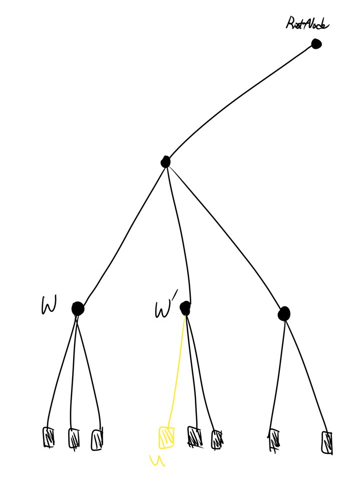 이 단계 이후에 Root node 역시 Degree Property를 위반하기 때문에 추가적인 작업을 해야합니다. 삭제 작업은 추가 작업에 비해 훨씬 까다롭습니다. Leaf node u를 parent node w로부터 제거하려면 일단은 제거합니다. 만약 w가 삭제 작업 전에 두 개의 children node를 가지고 있었다면 삭제 작업 이후엔 Degree property를 위반한 셈이 될 것입니다. 이를 해결하기 위해 w의 형제 node인 w`을 살펴봅니다. w의 형제node w`의 존재가 자명한 이유는 Degree Property에 기인합니다.