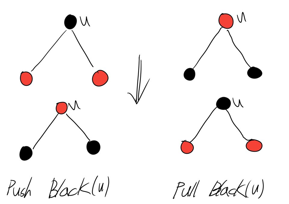 Figure b.2 Figure b.1는 Black Height Property를 유지하며 색깔을 조정합니다. PushBlack(u)는 두 개의 Red Node를 가진 Black node를 Parameter로 node u를 취합니다. 받은 black node u를 Red로, u가 가진 Red Children을 Black으로 칠합니다. PullBlack(u)는 PushBlack(u)의 정반대의 기능을 수행합니다. SwapColours라는 추가적인 함수를 만들어 두 개의 서로 다른 node의 색을 바꿔주는 간단한 함수를 구현해야 합니다.