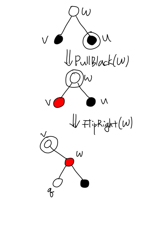 FlipRight(v)는 q를 v와 w의 Parent node로 만듭니다. 곧바로 PushBlack(q)을 호출하면 v와 w를 모두 Black으로 만들며 q를 원래 색으로 되돌려놓습니다. 놀랍게도 Double black은 사라졌고 No-Red-Edge와 Black-Height 두 성질 중 하나라도 위반하는 Node는 존재하지 않게 되었습니다. 여전히 한 가지의 문제가 여전히 남아있는데 v의 right child가 Red일 수 있으며 Left-Leaning 성질을 위반할 가능성이 존재한다는 사실입니다. 이 일말의 가능성까지 검토한 이후에 만약 필요하다면 FlipLeft(v)를 수행하고 나서야 마침내 다음 작업으로 넘길 수 있습니다.