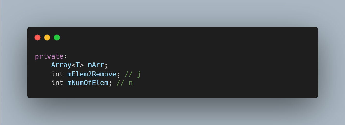 Remove()를 implement하기 위해서, 가장 먼저 후에 반환(Return)하기 위해서 a[j]의 값을 저장해 준다. 그 다음, mNumOfElem을 1만큼 감소시키고 mElem2Remove ( modulo mArr.mLength )는