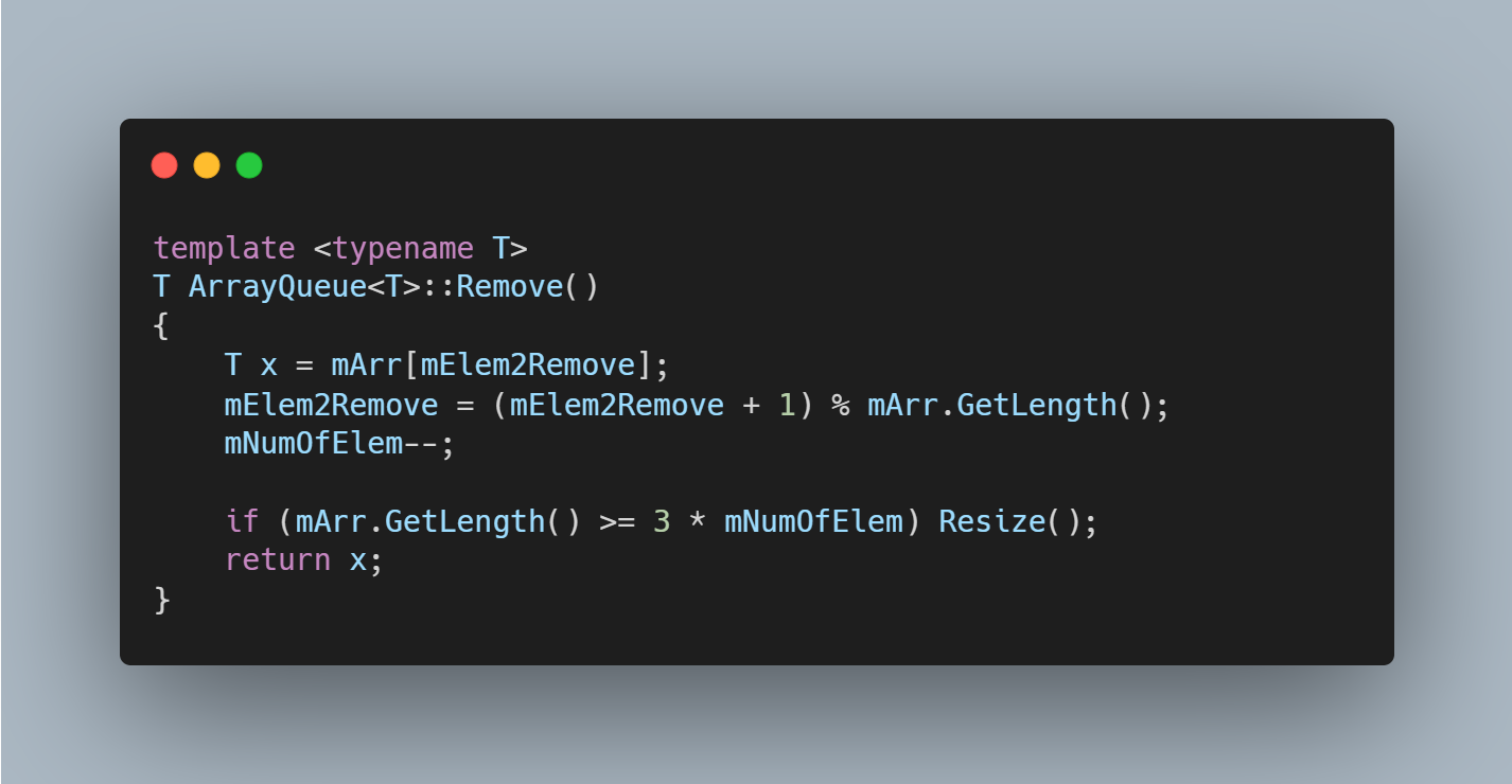 mElem2Remove = ( mElem2Remove + 1 ) mod mArr.mLength로 설정해준다. 마지막으로 붙들고 있던 mArr[mElem2Remove]값을 반환한다. 만약, 필요하다면 배열의 크기를 수축시키기 위해서 Resize()를 호출한다.