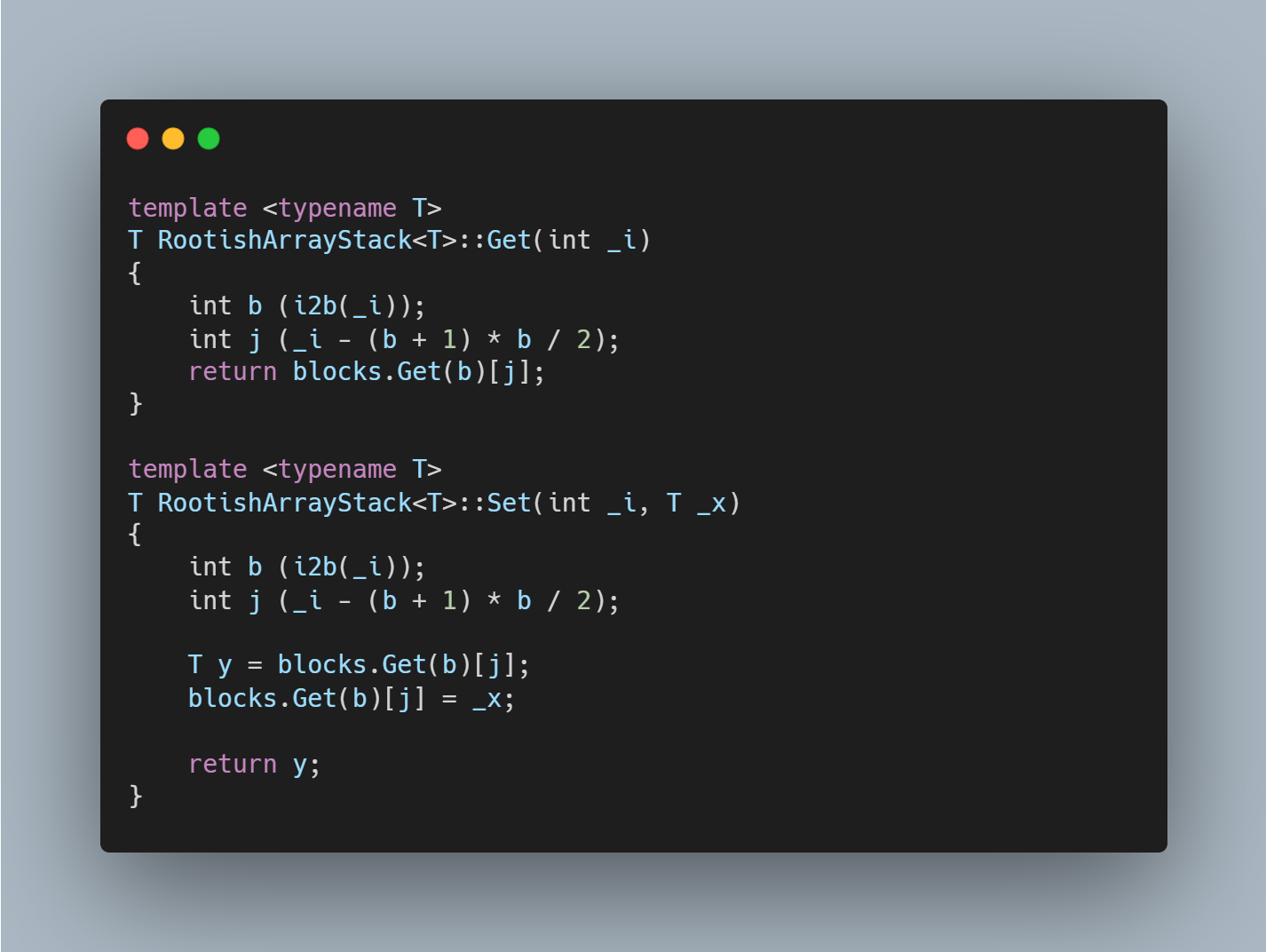 이러한 방법을 토대로 Get과 Set을 직관적으로 작성할 수 있다. 가장 먼저 적절한 block b를 찾아내고 해당 block 내의 index i가 위치할 index j를 계산하면 된다. 마지막으로 호출한 각 함수마다 적절한 조치를 취하면 끝이다. 일반적으로 이 작업들은 Constant time내에 완료된다.