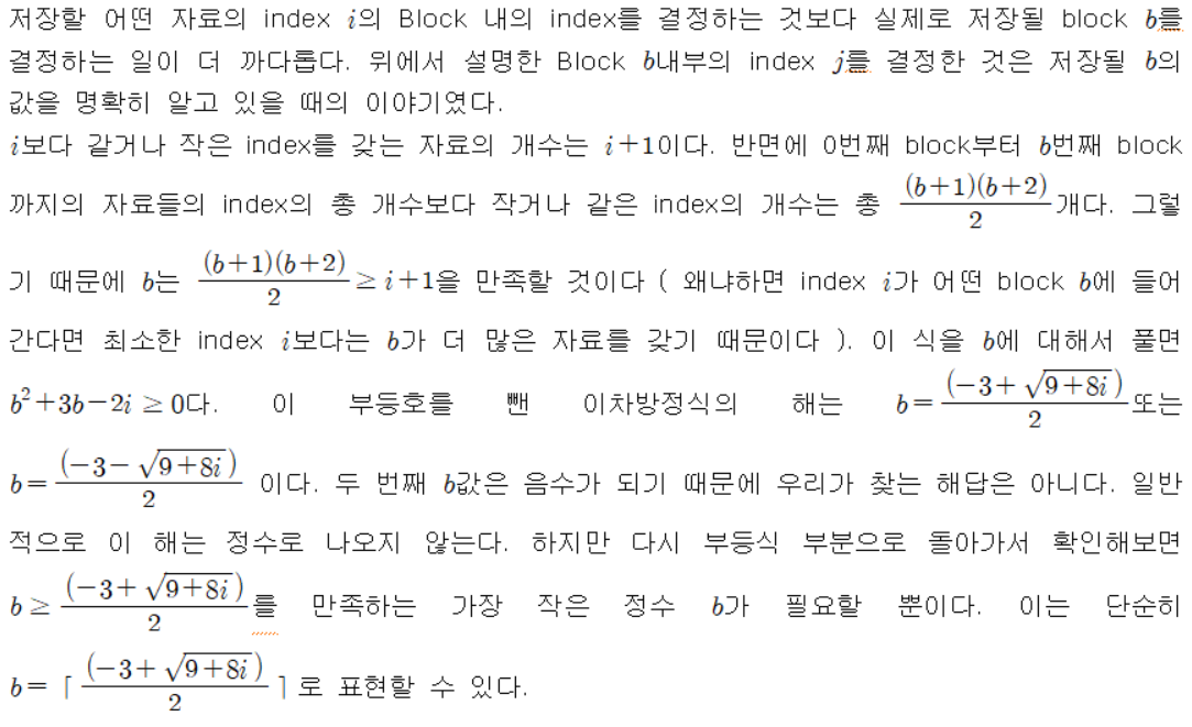 Grow()와 Shrink()의 호출 직후의 상황은 정갈하다고 표현할 수 있다. 마지막 Block은 아무것도 저장하고 있지 않을 것이며 그 이전 Block은 모든 배열에 자료를 저장하고 있는 상태일 것이다. 이 상태에서 더 자료를 추가하거나 한 Block을 비우기 전까지 Grow()나 Shrink()가 호출되는 일은 없다. 따라서 설령 이 두 함수의 Running time이 O(r)이라고 하더라도 Amortised running time을 생각하면 Amortised running time으로서는 O(1)이라고 할 수 있다.