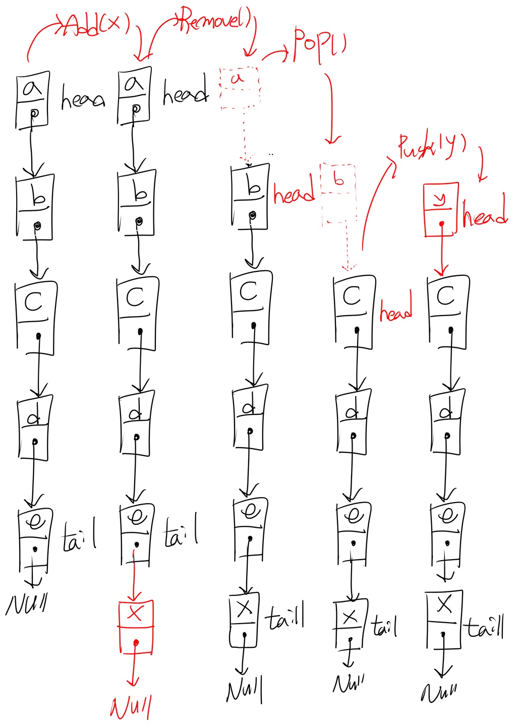 기능이 많고 정신없어 보이기는 하지만 { Add(x), Remove() } 는 Queue(), { Push(y), Pop() }은 Stack의 작업에 해당한다. Add와 Push가 각각 tail, head에 추가된다는 점을 확인하면 Remove와 pop이 어째서 head를 잘라내는지 이해할 수 있다.