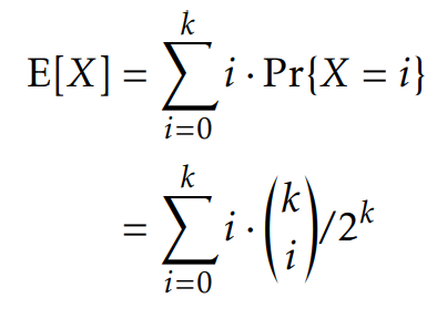 예제) 동전 던지기를 한다고 가정하자. k번 던질 것이고 이때 동전이 head일 때의 Expected value를 알고 싶다. 직관적으로 답이 k/2이라고 생각은 하지만 엄밀하게 풀어보면 다음과 같다.