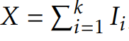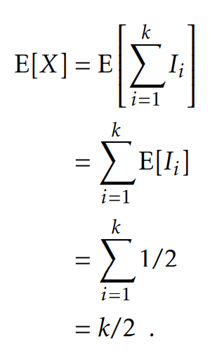 사실 여기서 Pr{X=i}와 두 개의 Binomial을 풀 배경지식을 요구하기는 한다. 이때, Indicator variables와 Linearity of expectation을 사용해서 풀면 위의 풀이보다 훨씬 쉽게 풀 수 있다. 1부터 k에 해당하는 각각의 i에 대해서 다음과 같이 indicator variable을 정의하면