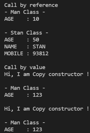 이제, Base class였던 Man으로 다시 돌아갑니다. 이 Base 클래스는 컴파일러가 슬쩍 달아주는 포인터가 있고 이 포인터는 Base클래스의 모든 가상함수들의 주소에 해당하는 가상함수테이블로 이어지고 있습니다. Call by value의 호출을 하면 argument로서 Base class의 reference가 아니라 복사생성자가 호출되면서 Man 부분 만큼 복사본이 올라갑니다. 완전히 똑같은 Man을 복사하면 vptr로 Stan에 접근할 수 있을 것 같습니다. 하지만 복사생성자가 Base 클래스인 Man의 가상함수테이블을 생성한다는 점이 문제입니다. 이렇게되면 vptr[Virtual Table Pointer]를 죽을 때까지 호출해도 Derived 클래스인 Stan의 멤버에 접근할 수가 없습니다. 따라서, Call by Value 호출 시, Man의 가상함수테이블이 생성된 것이고 이에 따라 Stan의 멤버들이 잘려버린 것입니다. 바로 이 부분을 Slicing이라고 일컫습니다. 정말 Copy constructor를 호출하는지 확인을 해봅니다.