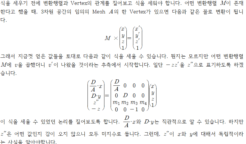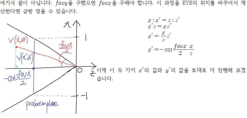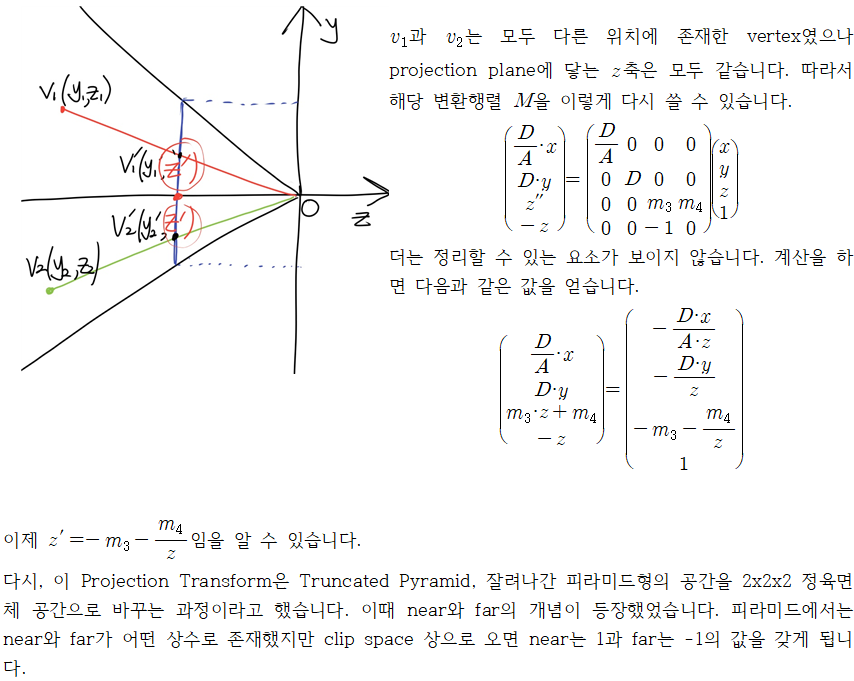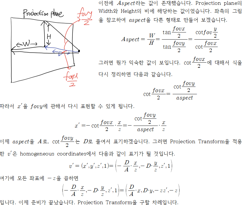 개인적으로 그래픽 이론 수업에서 꽃이라고 여겼습니다. EYE, AT, UP등의 요소들은 Camera의 External Parameters라고 합니다. 그럼 Internal Parameters도 존재할 겁니다. 카메라 렌즈, 줌의 정도, 굴절 등등이 Internal Parameters입니다. 이 Projection Transform은 Internal parameters에 의해 결정이 됩니다.
