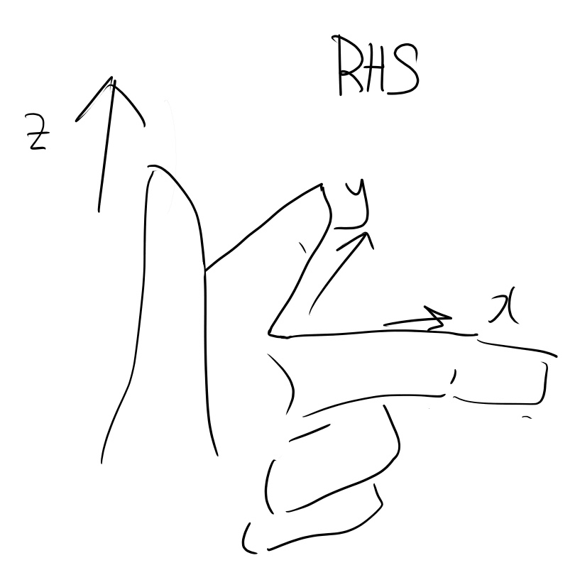 삼차원 Cartesian coordiantes system에서는 Right-handed[RHS] 또는 Left-Handed[LHS]를 사용합니다. RHS에서는 오른손 엄지가 향하는 방향이 z축의 양의 방향이고 남은 손가락이 y축에서 x로 말려서 들어간다고 합니다. 솔직히 강의 시간에 그림을 봐도 직관적으로 와 닿지도 않고 무슨 말인지도 몰랐습니다. 그래서 시험을 볼 때도 사실 마음대로 바꿔서 생각했습니다.