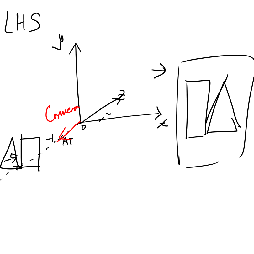 예를 들어서, 카메라의 위치(EYE)를 (0, 0, 0)이라고 가정하고 At은 (0,0,-1)이라고 해봅시다. 그렇다면 RHS 시스템에서는 다음과 같은 식으로 물체의 상이 잡힐 것입니다.