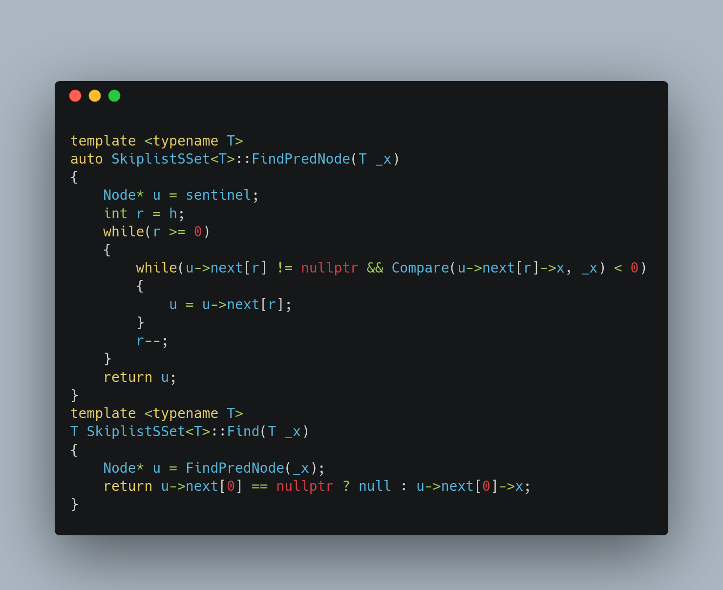 Add operation은 복잡합니다. 추가하려는 정보를 x라고 합시다. 그러면 x가 들어가야 할 L0의 linked list 내의 자리를 찾고 임의의 높이 k를 PickHeight()로 결정한 뒤 그곳에 넣습니다.(원문 : 継ぎ足す 로 추가하여 길게 늘인다는 의미가 있습니다.) 이를 가장 편리하게 구현하는 방법은 Stack을 이용하는 방법이 있습니다. 탐색경로(探索経路 or path)가 있을 때, Lr에서 Lr-1로 내려가는 노드를 Stack에 쌓는 것입니다. 더 정확하게 말하면 Lr에서 Lr-1로 내려갈 때, Lr을 Stack[r]에 저장하는 겁니다. 이렇게 하면 L0에 어떤 노드가 삽입 되었을 때, 수정되어야 할 남은 노드들을 모아 놓을 수 있습니다. 이 실장[実装 or Implementation]이 다음과 같습니다.