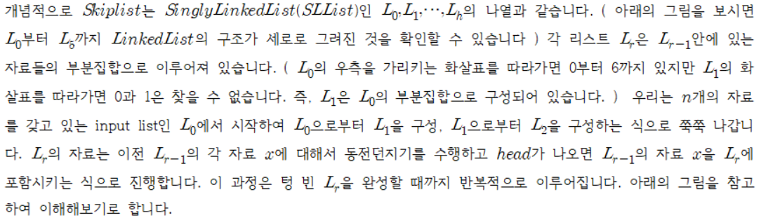 w->next[i] 는 새롭게 추가된 노드 w의 L_i층의 다음 노드, 즉 w보다는 큰 노드를 가리킵니다. 그건 어디에 있겠습니까? Stack[i]->next[i]에 있습니다! 이 Skiplist의 좌상단에서 시작하며 Stack[r]에 Lr을 집어 넣었기 때문에 Stack[0]에는 L0에 해당하는 노드가 있기 때문입니다. 그래서 w->next[i] = Stack[i]->next[i]는 w보다 큰 값 바로 뒤에 노드를 추가하는 과정인 것입니다. 그러면 w가 삽입되기 전에, w보다는 작은 어떤 값의 다음을 w로 연결해주면 됩니다. Stack[i]->next[i] = w;이 바로 그 과정입니다. 이제 Skiplist를 이해함에 있어서 어려운 과정은 모두 넘겼습니다!