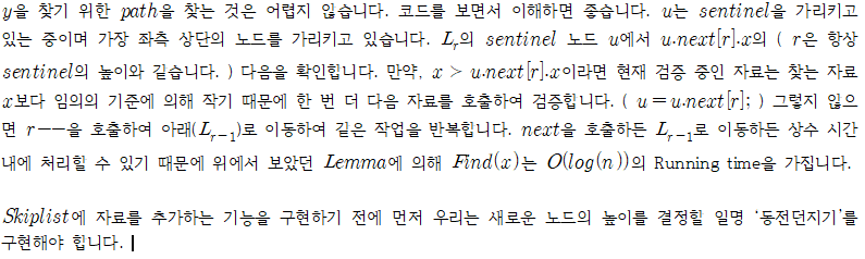 그러면 마지막 for(int i = 0; i < w->height; i++)의 역할이 궁금합니다. 선언된 모든 변수들의 정의를 이해했다면 어렵지 않습니다. 분명, 노드에 포함된 next[i]는 L_{i} level(층 또는 linked List)에서 해당 노드 다음에 올 노드를 가리킨다고 했습니다. 그리고 Stack에는 어떤 노드를 찾다가 Lr에서 Lr-1로 내려가는 순간에 Lr을 stack[r]에 집어 넣기로 했습니다.