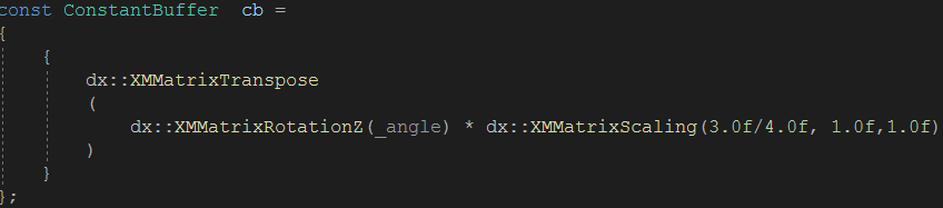 기존의 코드를 위와 같이 바꾸었습니다. 작성하기도 편하고 보기도 좋고 똑같이 잘 돌아갑니다. XMMATRIX는 Asterisk 연산자가 Overload되어 있습니다. 따라서 다음과 같은 코드도 위와 완전히 같은 역할을 합니다.