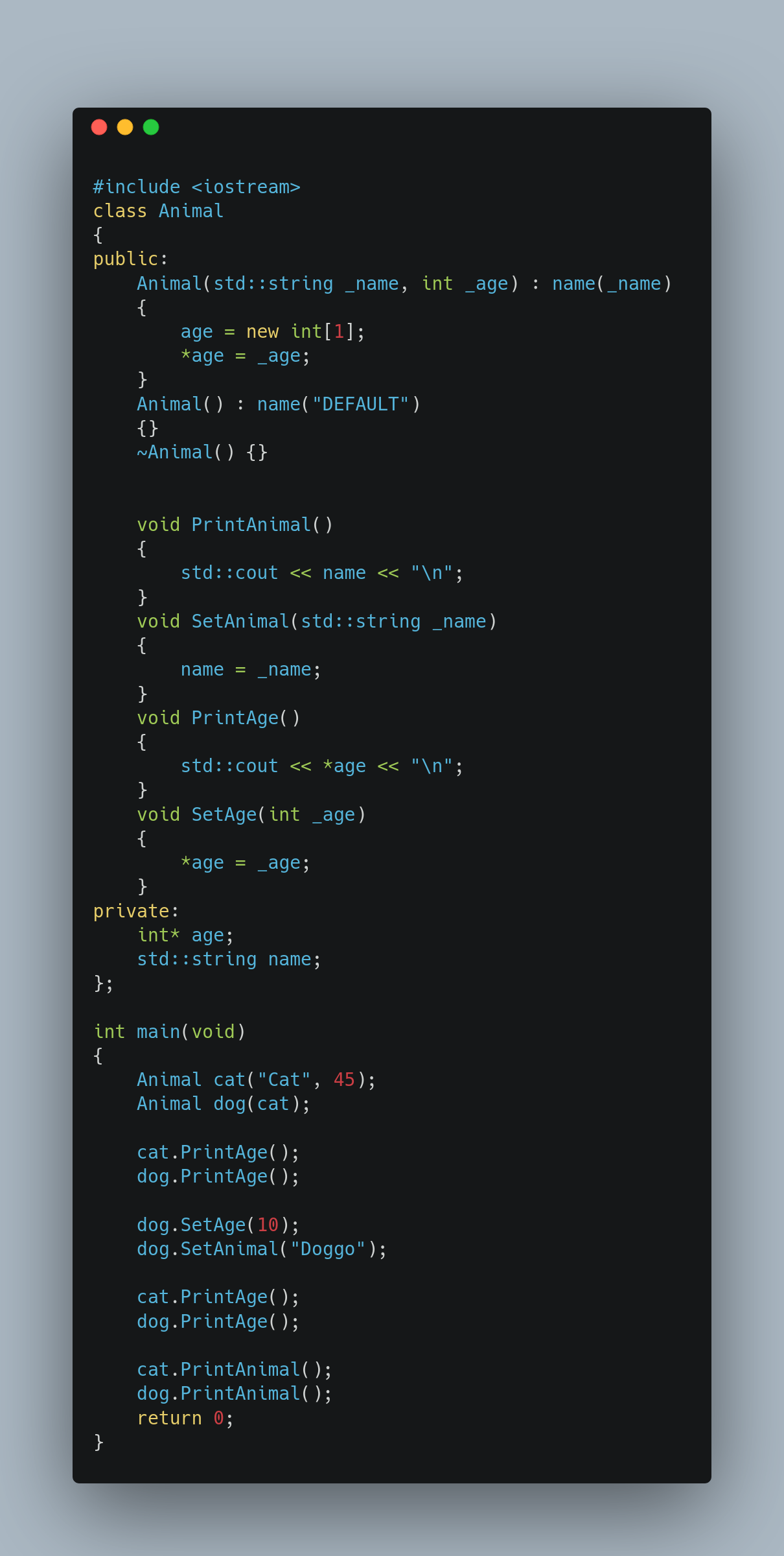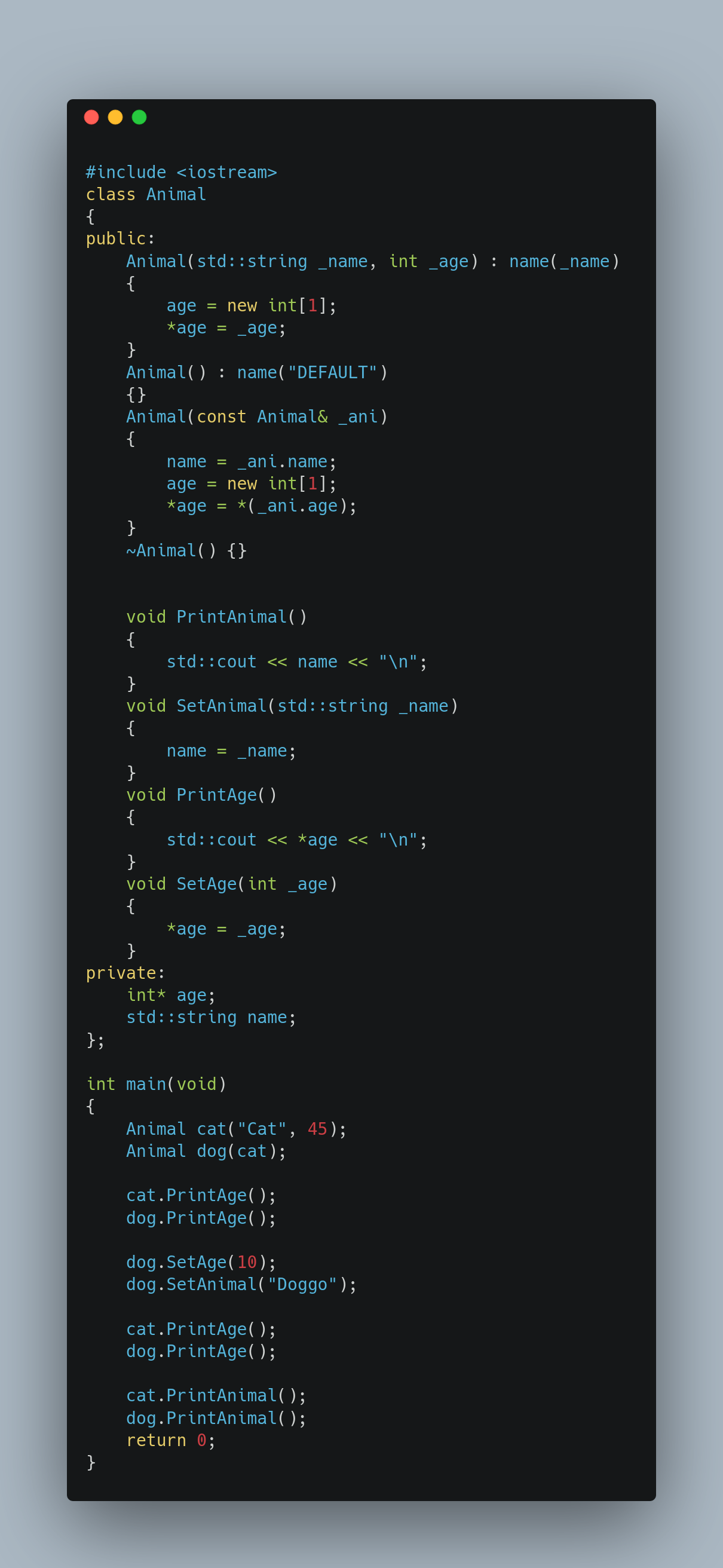 배우기를 heap allocation이 아니면 Shallow copy가 괜찮다고 했습니다. 그래서 귀여운 동물의 이름은 Stack영역에 할당하고 나이는 heap에 주었습니다. 메모리의 영역에 대한 것은 컴퓨터 구조나 운영체제에서 자세히 배웠습니다. dog는 Cat을 통해 만들었기 때문에 Cat의 member variables을 그래도 받습니다. Copy Ctor을 통해서 근거를 확인할 수 있습니다. 결과는 다음과 같습니다. 위에 설명된 대로, 잘 돌아가는 것 같습니다.