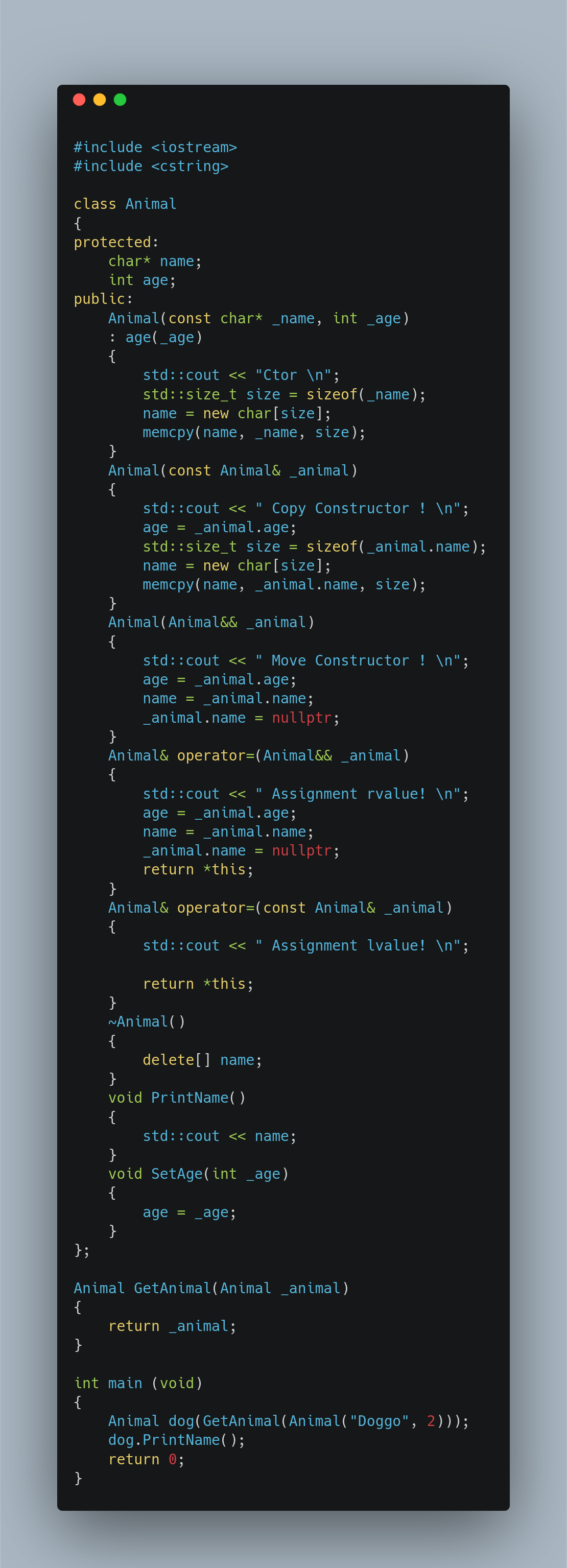 rvalue와 lvalue를 구분할 수 있다는 사실은 대단히 중요합니다. 이제 Copy Constructor나 Assignment Constructor를 호출할 때, Argument로 나타난 어떤 instance가 rvalue라면 새롭게 메모리를 할당하지 않고 해당 instance를 이동(MOVE)시키게 될 것입니다. 확실한 차이가 있습니다. 위의 Animal Class를 사용해서 shallow/deep copy를 설명했을 때 사용한 코드를 보면 Copy ctor는 Argument가 rvalue이든 lvalue이든 새롭게 메모리를 할당하기만 합니다. 애초에 디자인을 구분을 할 수 없게 만들었습니다. Class의 복사되는 rvalue가 일반적인 primitive(integer, float etc)라면 복사를 해주면 됩니다. 하지만 pointer의 경우엔 약간 특별한 처리를 해야 합니다.