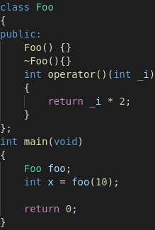 MSDN의 정보를 참조하면 Functor란 operator ()를 실장[実装/Implements]한 모든 데이터 타입을 이른다고 합니다. 이 괄호 오퍼레이터를 종종 Call operator, Application operator라고도 합니다. 이런 Functor에는 크게 두 가지 장점이 존재합니다. 하나는 상태를 포함할 수 있다는 것이며 다른 하나는 Functor자체가 데이터 타입이기 때문에 template의 parameter로 사용될 수 있다는 점입니다. 위의 Foo를 약간 변형하여 call operator가 parameter의 두 배의 정수를 반환하도록 만들어 어떤 식으로 사용되는지 익혀봅니다.
