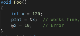 가령 int x = 123;과 같은 코드가 한 줄 있을 때 123은 어떤 number(엄밀하게는 Literal Constant입니다.)는 특정한 메모리 공간도 없이 프로그램이 실행 되는 동안 잠깐 레지스터에 존재하는 값에 불과합니다. 반면에 정수 x는 memory stack에 일시적으로나마 공간을 차지하는 값입니다. 그래서 C++는 Assignment operand(=)의 좌측 값으로 반드시 lvalue를 요구하게 됩니다. 메모리에 어떤 공간을 갖는다는 사실은 int* pInt = &x; 와 같은 Expression을 가능하게 해줍니다. 한 가지 눈여겨 보아야하는 점은 Address of operator &는 rvalue를 반환한다는 점입니다.