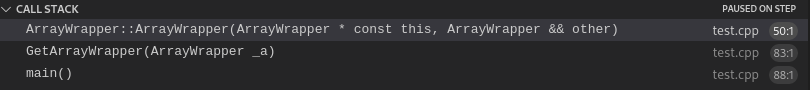 Callstack을 보면 이제 GetArrayWrapper의 return을 위해서 ArrayWrapper의 rvalue constructor가 호출되었음을 눈으로 확인할 수 있습니다.