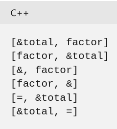 위에서 했던 것처럼 람다 식은 Capture Clause로 시작됩니다. 어떤 변수를 Address로 참조하려면 Address of (&)를 사용하고 아니면 안 쓰면 됩니다. C++ 14표준부터는 람다의 Body에 새로운 지역변수를 선언할 수 있게 되었습니다. MSDN을 참조하면 다양한 방식으로 Capture clause를 구성할 수 있으며 몇 가지 제한 사항이 있다는 사실을 알 수 있습니다.