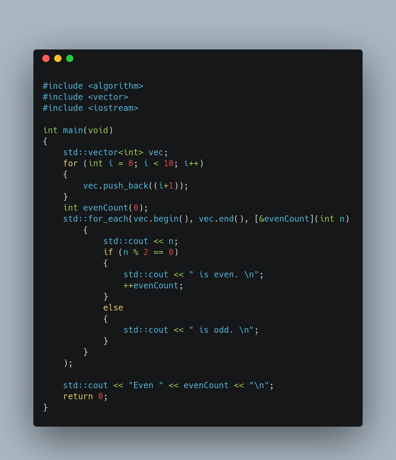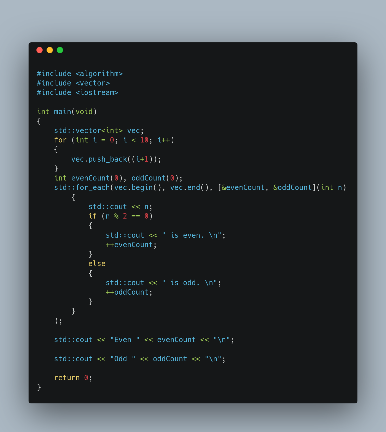 .. Lambda Expression의 한 예시입니다. 정확히는 for_each의 세 번째 Parameter가 lambda expression입니다. [&evecCount]가 람다 표현식이 시작함을 알리며 (int n)이 람다 표현식에 사용될 Parameter를 알립니다. 그리고 남은 중괄호가 Lambda Expression의 Body입니다. 그런에 []부분은 외부에서 parameter를 받는 역할도 함께 수행하는 것 같습니다.