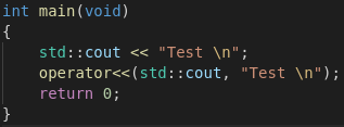 이 Overloaded Operator는 일반적인 Unqualified name lookup, Scope와 namesapce뿐만 아니라 Argument에서도 namespace를 찾게 됩니다. 그래서 위의 코드에서는 Global Area에서 정의된 operator<<라는 namespace가 없지만 operator<<의 left argument인 std가 있기 때문에 ADL이 std::cout의 operator<<를 유추해옵니다. 아래의 operator<<(std::cout, "Test \n);은 위의 표현의 함수형 표현으로써 왼쪽 Argument에 명시적으로 namespace std가 적혀 있는 것을 확인해 볼 수 있습니다.