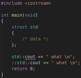: 아마 [ :: ] 이렇게 콜론이 두 번 찍혀있는 기호를 종종 보았을 텐데 이것이 The scope resolution operator입니다. 한국말로 의역하면 '스코프를 풀어 해석하는 기호' 정도일 겁니다. 이 기호 우측에 적혀 있는 name이 바로 Qualified name입니다. 종류까지 명시하면 Class의 Member들, enumeration type의 member들, namespace의 명시 등이 있습니다. 그런데 Scope resolution operator 좌측에 아무것도 없는 경우가 있습니다. 이는 namespace lookup을 global에 대해서만 실시하게 만듭니다. 예를 들어서 다음과 같이 struct의 name을 std라고 해버리면 std::cout 은 struct에 대해서 실시되지만 ::std::cout으로 사용하면 해당 scope가 아닌 global에 존재하는 Std를 찾아 수행합니다.